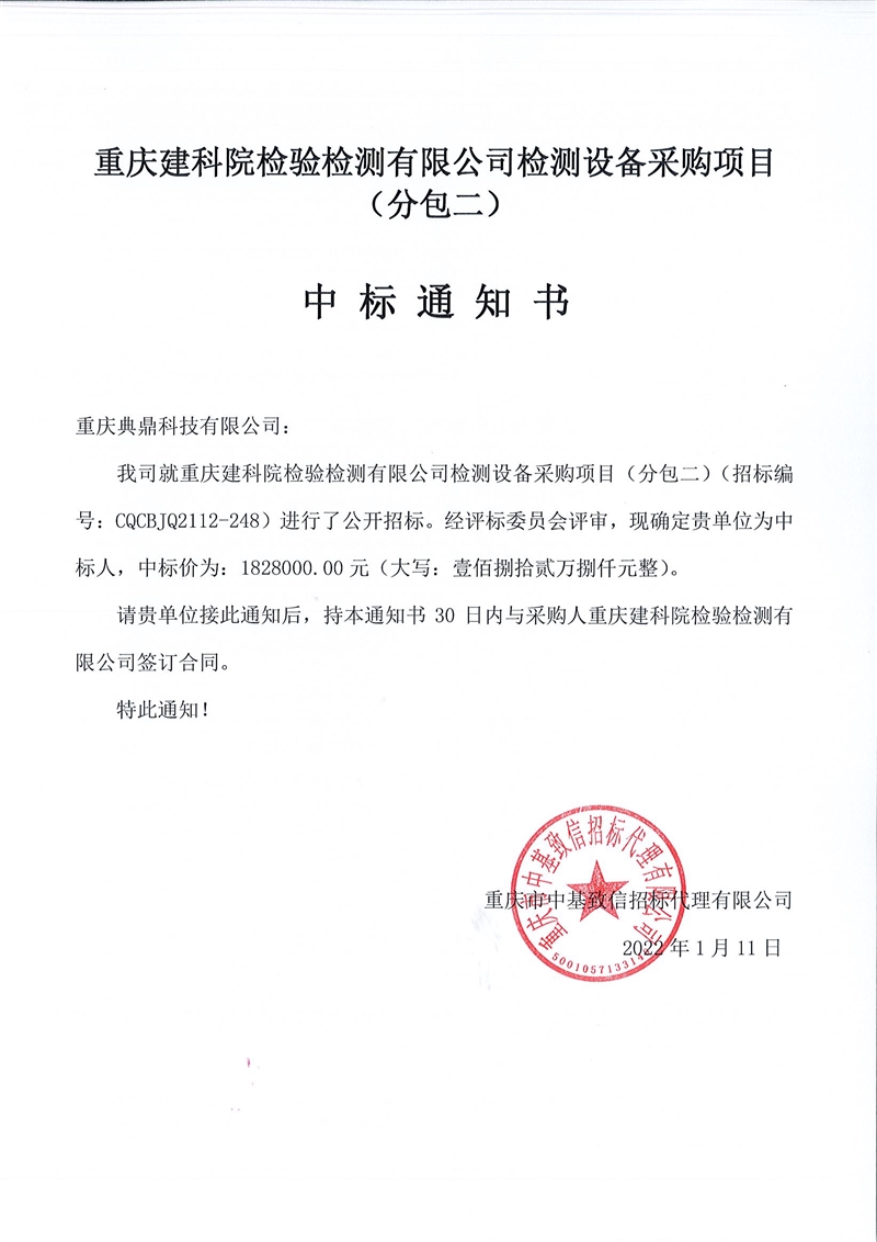 重慶建科院檢驗(yàn)檢測有限公司委托重慶市中基致信招標(biāo)代理有限公司對(duì)我公司檢測設(shè)備采購項(xiàng)目(項(xiàng)目號(hào):CQCBJQ2112-248 )分包一(力學(xué))和分包二(化學(xué))進(jìn)行了公開招標(biāo)采購,現(xiàn)已完成全部采購程序。確認(rèn)重慶展宇儀器設(shè)備有限公司為分包一(力學(xué))中標(biāo)人,中標(biāo)價(jià)為2305000元(貳佰參拾萬伍仟佰元整)。確認(rèn)重慶典鼎科技有限公司為分包二(化學(xué))中標(biāo)人,中標(biāo)價(jià)為1828000元(壹佰捌拾貳萬捌仟元整)。