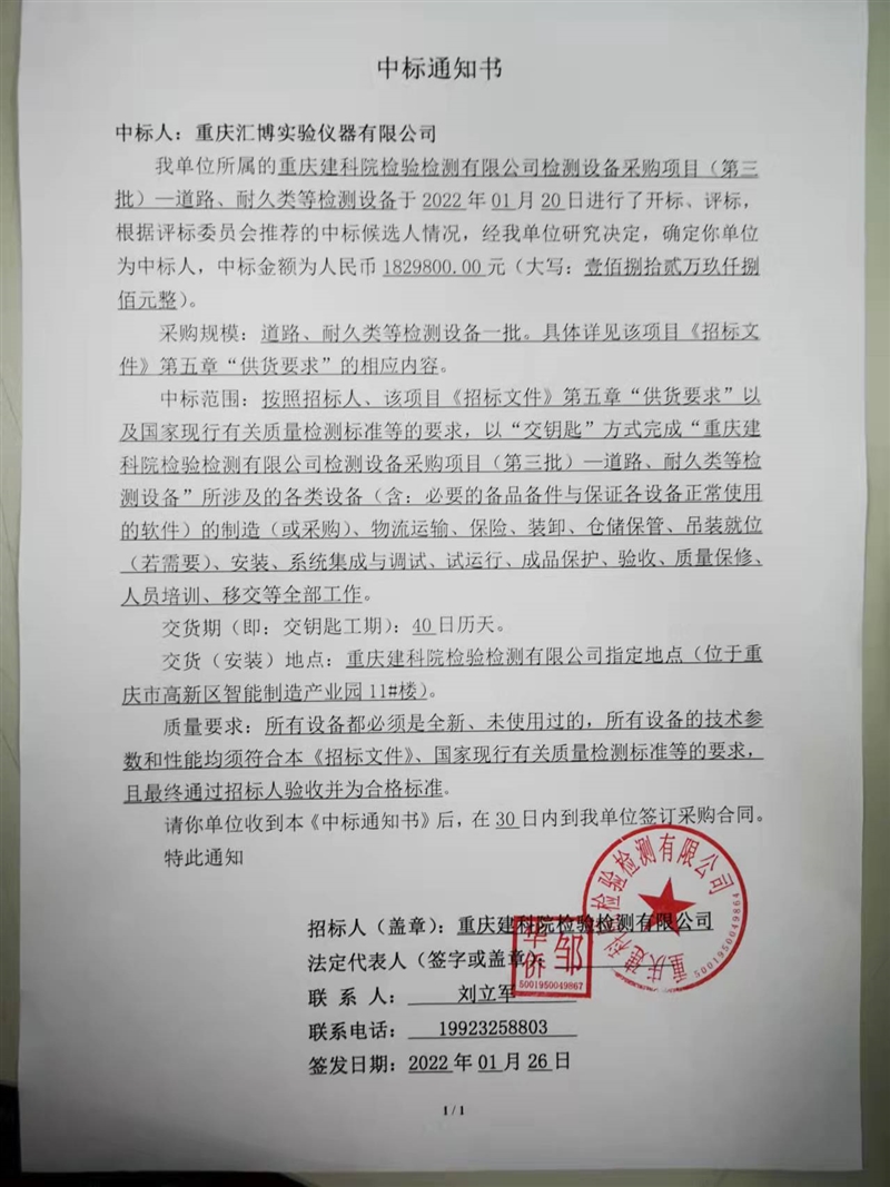 重慶建科院檢驗檢測有限公司委托中招國際招標有限公司對我公司檢測設備采購項目(項目號:TC219D1RL )重慶建科院檢驗檢測有限公司檢測設備采購項目(第三批)—道路、耐久類等檢測設備進行了公開招標采購,現(xiàn)已完成全部采購程序。確認重慶匯博實驗儀器設備有限公司為檢測設備采購項目(第三批)—道路、耐久類等檢測設備中標人,中標價為1829800.00元(大寫:壹佰捌拾貳萬玖仟捌佰元整)。