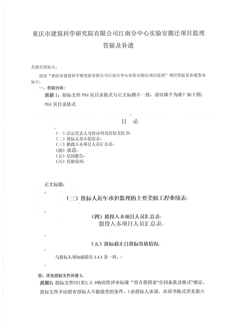現(xiàn)對“重慶市建筑科學研究院有限公司江南分中心實驗室搬遷項目監(jiān)理”項目答疑及補遺發(fā)布如下: