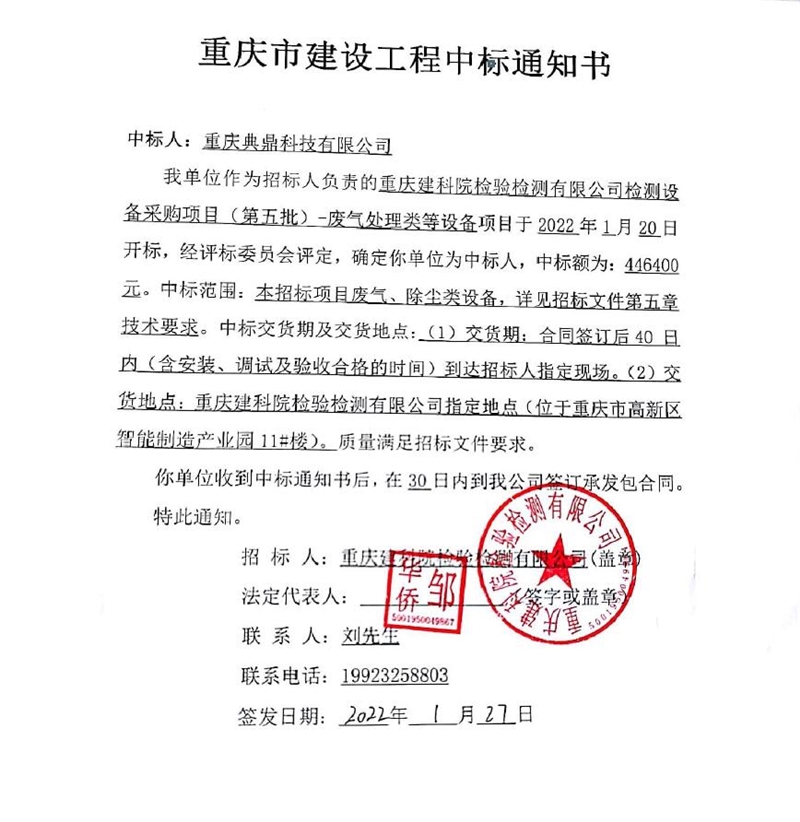 重慶建科院檢驗檢測有限公司委托重慶市工程管理有限公司對我公司檢測設(shè)備采購項目(項目號:CQEM-ZB-22002 )重慶建科院檢驗檢測有限公司檢測設(shè)備采購項目(第五批)-廢氣處理類等設(shè)備進(jìn)行了公開招標(biāo)采購,現(xiàn)已完成全部采購程序。確認(rèn)重慶典鼎科技有限公司為檢測設(shè)備采購項目(第五批)-廢氣處理類等設(shè)備采購項目中標(biāo)人,中標(biāo)價為446400元(大寫:肆拾肆萬陸仟肆佰元整)。