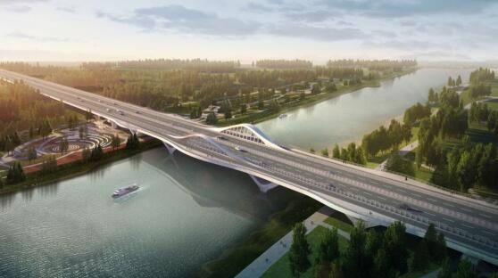 安運橋主橋設計采用梁-拱型組合體系,立意“荷香”,將荷葉形態(tài)融入到橋梁造型當中,荷葉浮于運河之上,整個造型宛如運河上盛開的荷花,生態(tài)自然,與環(huán)境融為一體,給人以生機盎然、自然和諧的美感。