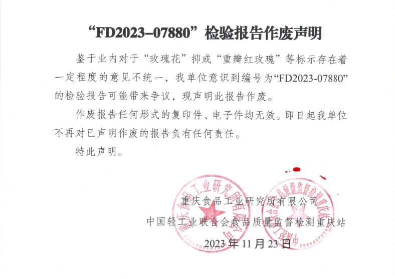 鑒于業(yè)內(nèi)對于“玫瑰花”抑或“重瓣紅玫瑰”等標示存在著一定程度的意見不統(tǒng)一,我單位意識到編號為“FD2023-07880”的檢驗報告可能帶來爭議,現(xiàn)聲明此報告作廢。