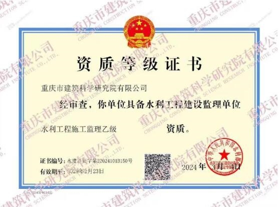 近日,經(jīng)國家水利部核準(zhǔn),重慶設(shè)計集團所屬子企業(yè)重慶市建筑科學(xué)研究院有限公司申請的水利部水利工程施工監(jiān)理乙級資質(zhì)成功獲批。