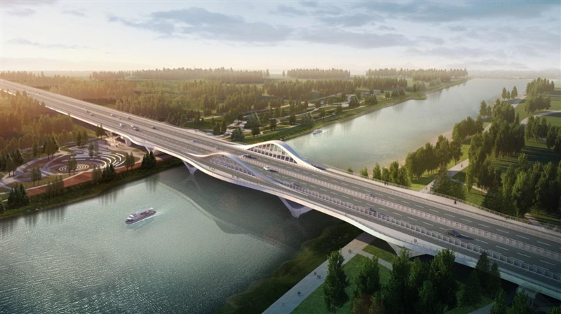 主橋設計采用梁-拱型組合體系,立意“荷香”,將荷葉形態(tài)融入到橋梁造型當中,荷葉浮于運河之上,整個造型宛如運河上盛開的荷花,生態(tài)自然,與環(huán)境融為一體,給人以生機盎然、自然和諧的美感。