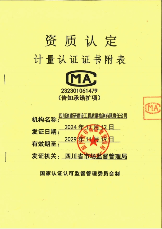 近日,重慶設(shè)計(jì)集團(tuán)市建科院公司所屬子企業(yè)四川渝建研建設(shè)工程質(zhì)量檢測(cè)有限責(zé)任公司(簡稱“四川渝建研公司”)在檢測(cè)技術(shù)領(lǐng)域取得重大突破,CMA(檢驗(yàn)檢測(cè)機(jī)構(gòu)資質(zhì)認(rèn)定)資質(zhì)參數(shù)由566項(xiàng)成功擴(kuò)增至1132項(xiàng),公司檢測(cè)資質(zhì)范圍由原先的“四大類”增至“八大類”,擴(kuò)項(xiàng)后公司檢測(cè)技術(shù)能力再上新臺(tái)階,滿足了水利工程檢測(cè)資質(zhì)必須參數(shù)需求,位居四川省檢測(cè)機(jī)構(gòu)中上游水平。