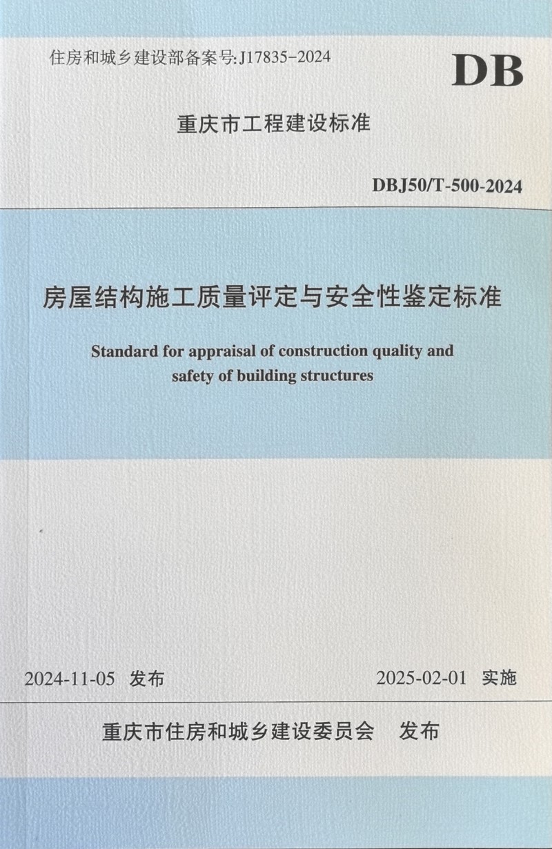 經(jīng)市住房城鄉(xiāng)建委批準(zhǔn),由市建科院主編的重慶地方標(biāo)準(zhǔn)《房屋結(jié)構(gòu)施工質(zhì)量評定與安全性鑒定標(biāo)準(zhǔn)》(DBJ50/T-500-2024)將于2025年2月1日起施行。