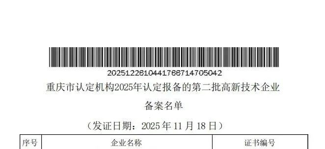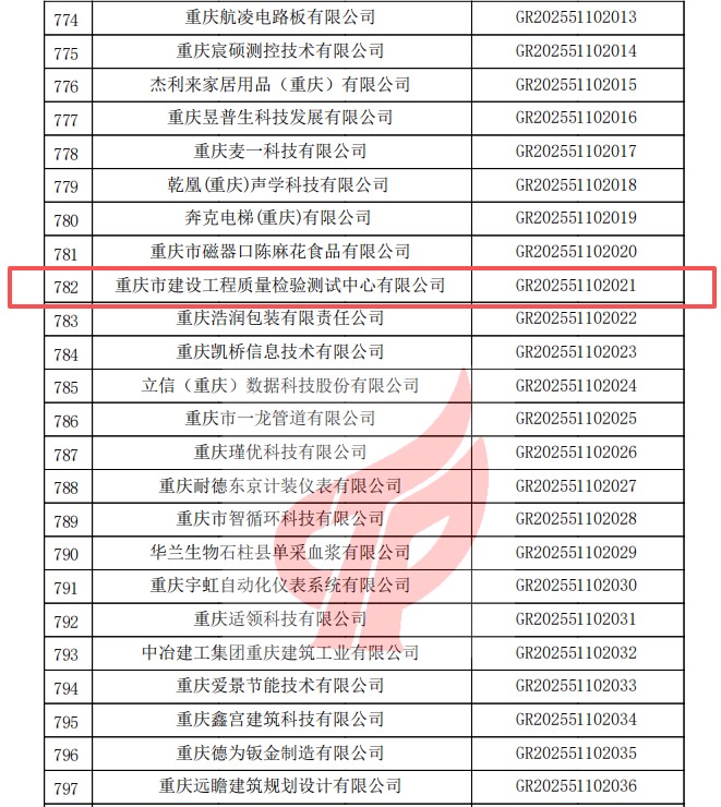 近日,全國高新技術(shù)企業(yè)認定管理工作領(lǐng)導小組辦公室正式發(fā)布《對重慶市認定機構(gòu)2025年認定報備的第二批高新技術(shù)企業(yè)進行備案的公告》,重慶設(shè)計集團市建科院所屬子企業(yè)重慶市建設(shè)工程質(zhì)量檢驗測試中心有限公司,獲評“國家高新技術(shù)企業(yè)”。