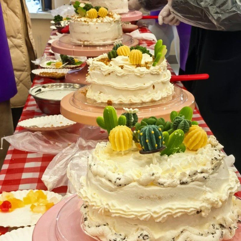 活動特邀專業(yè)烘焙師全程指導,現場宛如專業(yè)烘焙工坊,轉臺、抹刀等專業(yè)器具及新鮮食材一應俱全。烘焙師現場示范蛋糕制作的抹面技法,重點講解裱花技巧、裝飾布局等實操要點。女職工分組操作,通過奶油調色、裱花造型等創(chuàng)意實踐,完成各具特色的節(jié)日蛋糕?,F場此起彼伏的交流聲與歡笑聲中,既有裱花失誤引發(fā)的趣味互動,也不乏驚艷造型收獲的集體贊嘆。制作完成后,女職工們攜作品合影留念,并將成品封裝帶回家中分享。